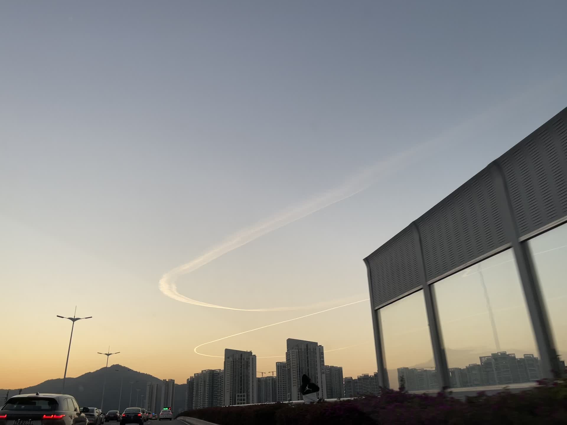 下班回家啦!!!发现天空多了两道划痕点缀,有点美呢~有时候不是完美无瑕才是最美的,对吧~