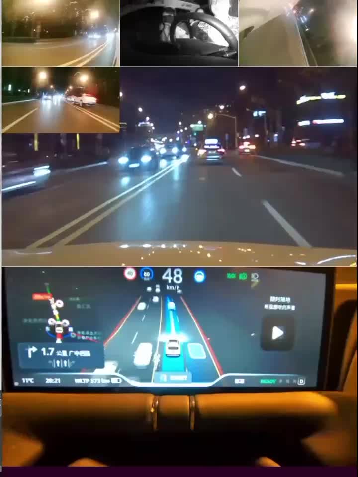 XNGP 首秀!20s 视频会有哪些亮点? 非常兴奋小鹏的 XNGP 终于亮相了,Rocky 在楼下已经分享了一个视频,有几个亮点欢迎大家随时补充哈: 1、识别红绿灯。 这是一个城市路段,可以看到 G9 还是在头车位置,也就是需要识别到红灯停止、识别绿灯起步,SR 界面展示了一个绿灯状态以及读秒界面,这个地方应该结合地图和视觉信息。 2、起步与识别加塞 有个亮点,G9 起步的时候比旁车还要快,并且把速度提到系统限速 60 km/h(道路限速 40km/h),随后隔壁车想避让前方静止车辆加速超越,所以这里刚好有一个被加塞的场景,我们只能从仪表看速度值的变化判断整个体验还比较流畅,起码起步不延迟、加速不拖泥带水。 3、无图化? 大家可以注意 SR 界面边缘的红线,这条红线是禁行区,并且是实时动态变化的,例如有缺口时红线也会有缺口,例如被隔壁的静止车辆遮挡时红线也没有被渲染出来,所以这些道路边缘的识别基本确定不是地图。 但实际上真正的纯无图可能性不大,猜测主干道还是以地图为主,例如车道线、红绿灯等还是用了地图数据,而例如辅路或者其他非主干道可能会摆脱地图,这些路口地图更新鲜度要求太高、成本高昂,无图来做准确度更高,并且可以提高 XNGP 的使用范围。 4、变道有什么亮点? 视频 10s 左右有一个变道动作,这里有两个亮点: SR 界面识别对向有一个摩托车侵占占道,系统发起一个变道要绕行(注意看这时候 G9 已经打了方向,但隔壁车道视野被前方出租车遮挡)。 这时候第二个亮点出现,车辆探了点头看到隔壁车道停了一辆静止打着双闪的静止车,这时候系统立刻取消变道,并且方向回正到主车道上。 这里从识别、预测、规划到控制整个连贯动作执行非常果断漂亮,并且视频中从发起变道到取消变道时长不到一秒,Xnet 看起来起了很大作用。 5、SR 交互有什么亮点? 无论是双 orin 还是 8155,屏幕上的模型细腻度、低延迟以及高刷新率带来的提升还是很明显的,特别是模型的数量以及精准度,停在 16s 可以看到对向的最左侧车道有个车辆拐入辅路、最右侧辅路上停止的车辆都识别进来了,大概是双向 6-8 车道的识别距离。过去担心的底部激光雷达的探测受限现在看还是多余了… 比较好玩的是系统还准确识别到对向车辆的摩托车,包括数量、朝向,包括上面和大家提到的逆行的两轮车。摩托车藏在车流中,很容易被漏检,而精准度高也不单只是为了炫,更重要的还是对城市道路中弱势交通参与者的识别。 非常期待 XNGP 的实路体验…