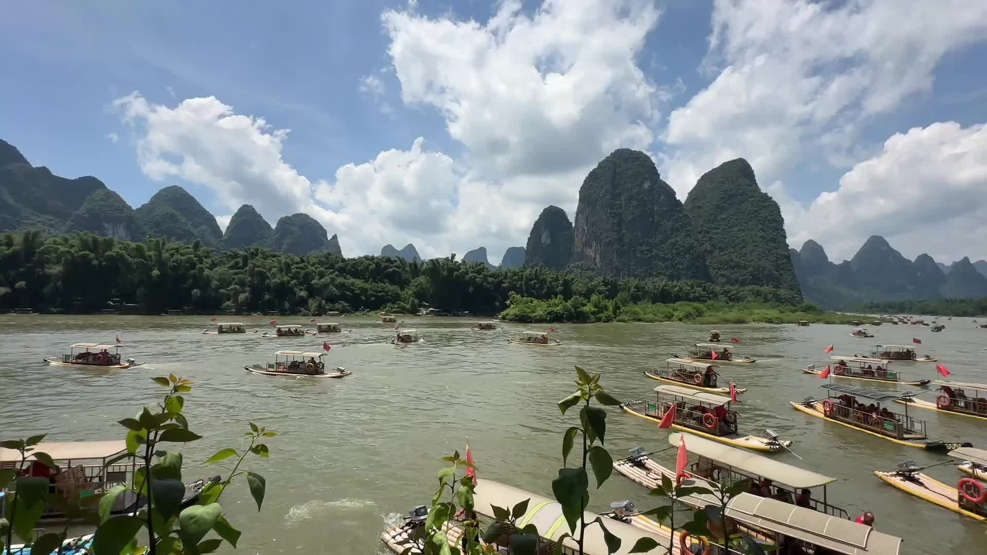 阳朔漓江朝板山码头,人民币20元打卡点附近,竹筏陆续的出发,真的是百舸争流的感觉